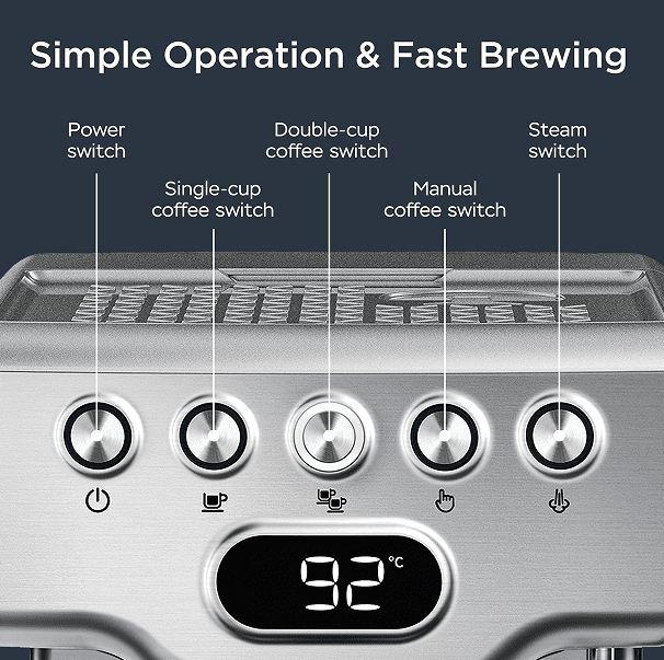 19 BAR professional pump: 19 BAR high pressure extraction of high quality coffee liquid filled with golden cream, make the espresso more fragrant and rich. Stainless steel boiler system makes espresso more fragrant and rich in Kima.