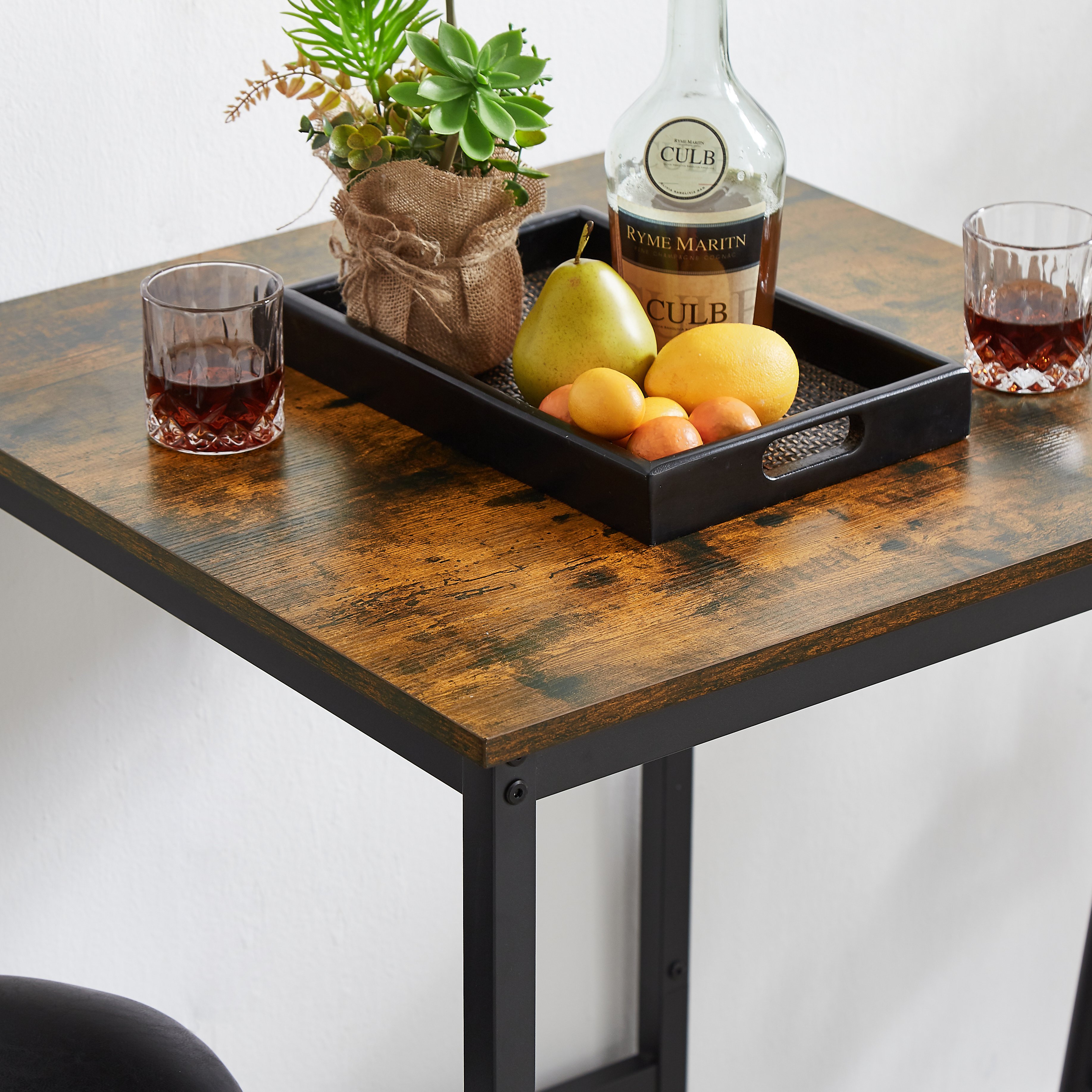 Pull these kitchen chairs Looped FootrestA looped footrest below offers all-round support and helps create proper postures to reduce fatigue.Product InformationProduct TypeBar table set of 3ColorRustic Brown,BlackMaterialParticleboard, PU Leather, Sponge, SteelTable Dimensions23.62'' W x 23.62'' D x 35.43'' HStool Dimensions13.4'' Dia x 36.22'' HHeight for the Seat to the Floor24.41''Table Weight21.8 lbStool7.8 lbTabletop Thickness0.6''Cushion Thickness2.36''Max. Static Load Capacity Tabletop300 lbMax. Static Load Capacity per Stool350 lbAssembly RequiredAbout 25 minNumber of packages1Package Contents1 x Bar Table, 2 x Bar Stool, 1 x Assembly Kit, 1 x Instruction