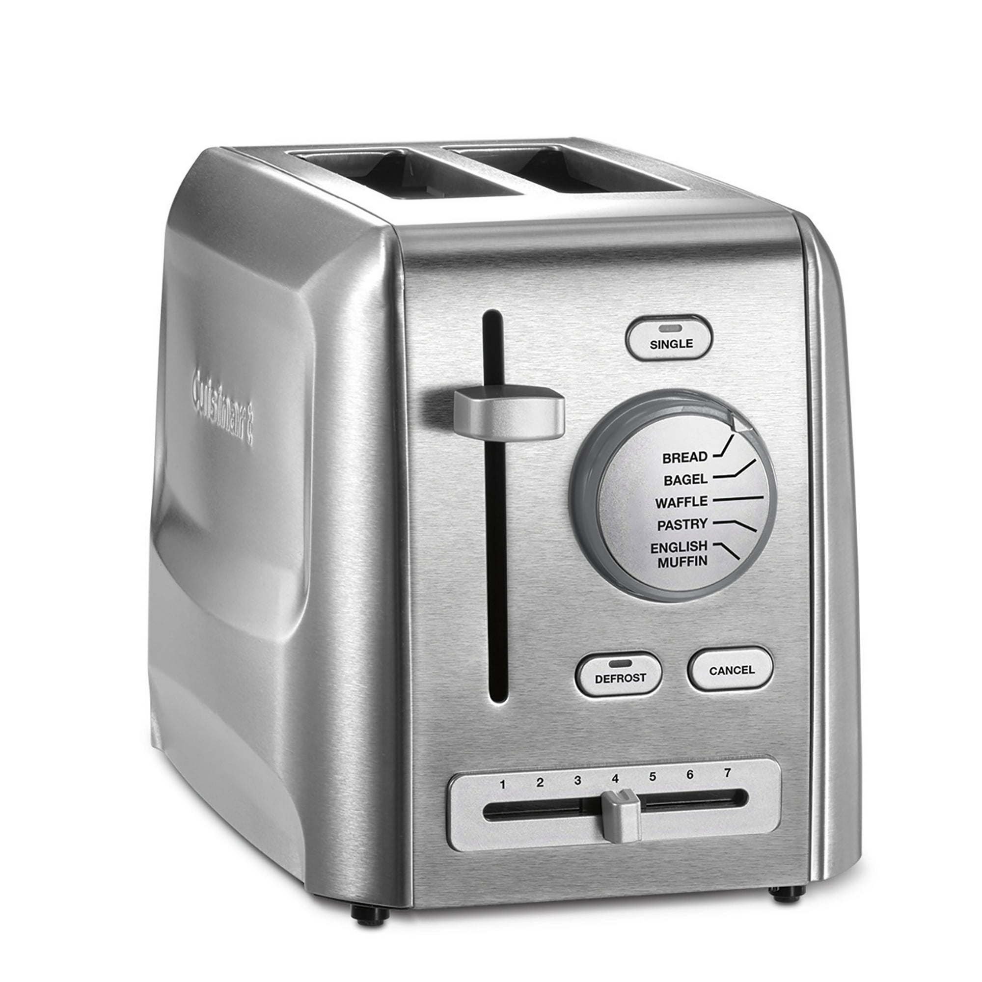 Whip up some delicious toast with ease using the stylish Cuisinart 2-Slice Toaster. It features seven shade settings and toast options for bread, bagels, English muffins, frozen waffles, and pastry. The silver toaster also features a pull-out crumb tray, stainless housing, large intuitive controls and defrost setting all with 900 watts of power providing excellent results. Add it to your countertop today or give it as a practical and useful housewarming gift. It fits easily in with other appliances and decor, making it a suitable choice for almost any modern kitchen.