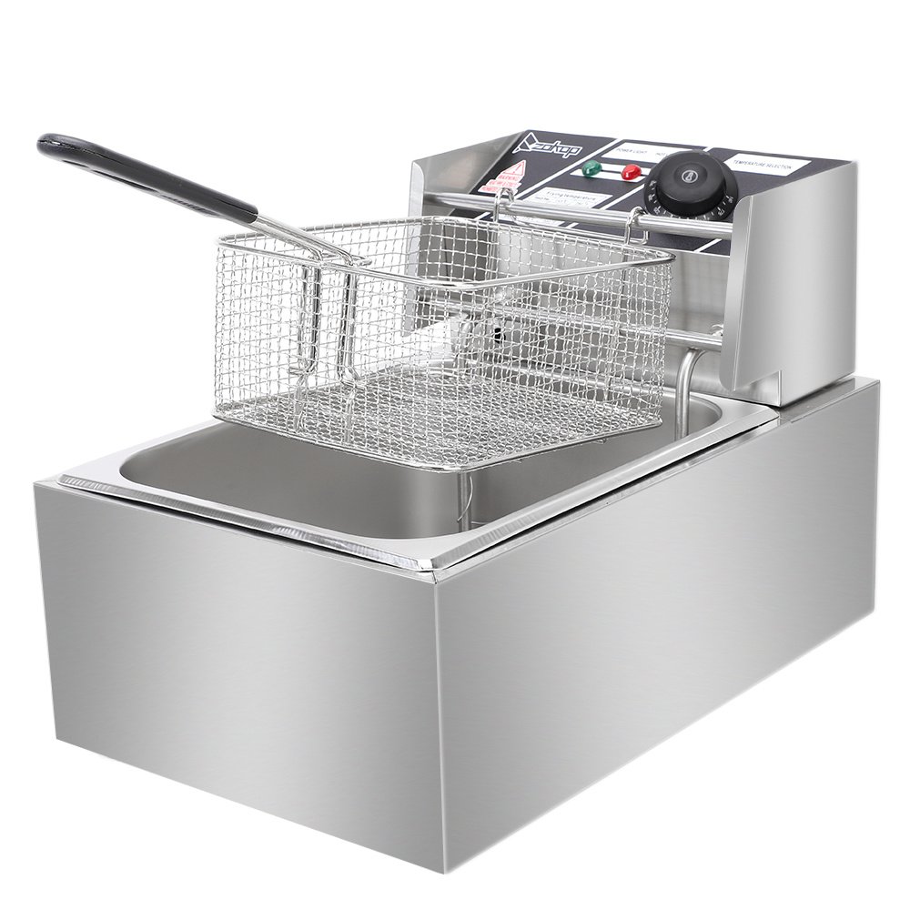 Introductions:This Stainless Steel Deep Fryer is durable for both home and commercial use. Easy to operate and clean. It is great for cooking French Fries, onion rings, egg rolls, fried chicken, panko shrimp and any other deep fried food.Features:1. Solid construction, made of heavy duty stainless steel2. Temperature indicator light displays when the fryer is heating the oil3. Heating pipe distributes even and quick heat4. Lid cover prevents the boil oil splashing and safely covers the oil when not in use5. Fryer basket with plastic handle prevents scalding of your hands and brings safe and easy operation6. Residue plate for filtering out the dregs7. Thickened tank for durable use, can be detached for easy cleaning8. Great for cooking French Fries, onion rings, egg rolls, fried chicken, panko shrimp and any other deep fried food9. Perfect for home and commercial useNotice: Please peel off the white plastic film before using.Specifications:1. MAX Power: 2500W2. Tank Capacity: 6.3QT/6L3. Voltage: 110V4. Frequency: 60Hz5. Temperature Range: 60℃ - 200℃ (140℉ - 392℉)6. Overall Dimensions: (17.3 x 11 x 12.2)" / (44 x 28 x 31))cm (L x W x H)7. Tank Dimensions: (11.8 x 9.5 x 5.9)" / (30 x 24 x 15)cm (L x W x H)8. Basket Dimensions: (8.3 x 7.3 x 4.1)" / (21 x 18.5 x 10.5)cm (L x W x H)9. Handle Length: 8.3" / 21.5cm10. Power Cord Length: 55" / 1.4m11. Weight: 8.6lbs / 3.9kgPackage Includes:1 x Single Tank Deep Fryer1 x Stainless Steel Basket1 x Handle1 x Stainless Steel Lid1 x Stainless Steel Residue Plate1 x Installation Package(4 x Feet 1 x Cover Handle)1 x Manual