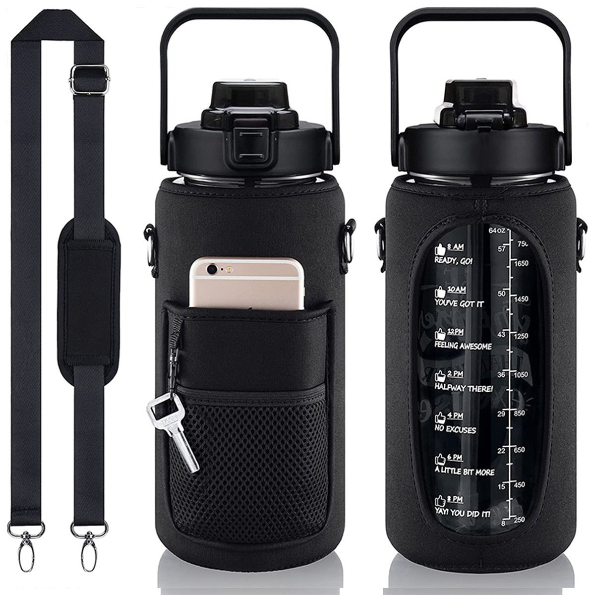 Half-Gallon Water Bottle With Sleeve 2L Leak-Proof, BPA-Free Sports Drinking Bottle With Straw And Custom Time Marker
