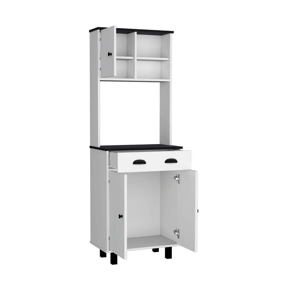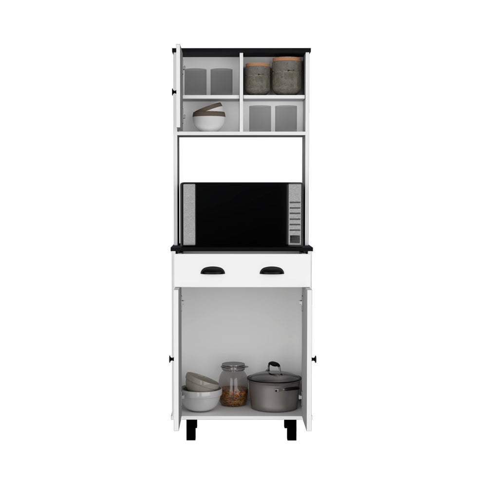 Elevate your kitchen with the "Naomi Kitchen Pantry," featuring a white finish with chic black handles. This unit includes an array of storage options, from shelving (5.7"H x 10.7" W) to a drawer (3.9"H x 11.1"), a cabinet (22"H x 12.9"D), and a microwave black space (22"W x 18.9"H), making it a versatile addition to any kitchen.Dimensions: Height: 66.54'Width: 23.62' Depth: 13.7'Furniture Type: Ready to assemble (full assembly required).Certifications: CARB phase II compliant – TSCA Title VI Compliant.Warranty: 1-year warranty coverage in wooden parts- 1-year warranty coverage in hardware pieces since its manufacturing date is found in the lot number printed in the product box.Shipment details: Free shipping to the 48 contiguous states - delivery time: Between 2 and 5 days, depending on the customer's location, season, and weather factors.Other details: This product does not include decorative or background elements; Check that the box is in good condition and well packed and check with the help of the manual that the corresponding parts have been included; For more information regarding warranty, shipment details, cancellations, returns & replacement parts go to the bottom section of our website to learn more; Installation & Assembly Instructions included.
