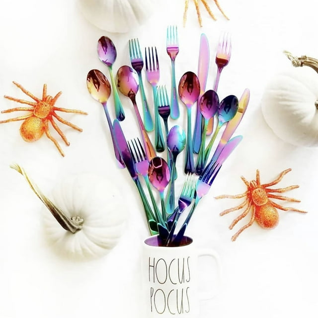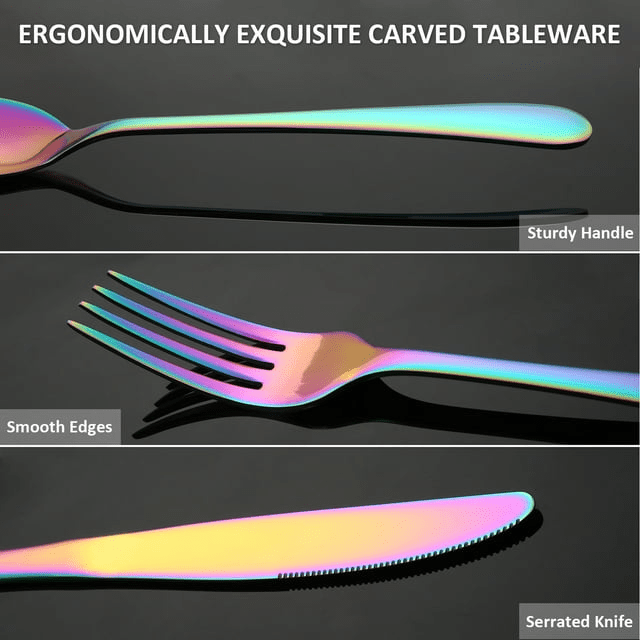 The lorena 20-piece flatware set combines function, form and fashion to turn average daily meals into exquisite dining experiences. The brilliant use of rainbow color with an exquisite mirror polish finish brings you a contemporary flatware design that clearly sets itself apart from more traditional options. Made from premium stainless steel, each eating utensil is nicely weighted, ergonomically designed, and well-balanced, perfect for everyday use or for special occasions like holidays, dinner parties or birthdays. The silverware set is dishwasher safe to make clean up quick and easy. Plus, the set is heat-resistant and rust-resistant for long-lasting use you can rely on for years to come.