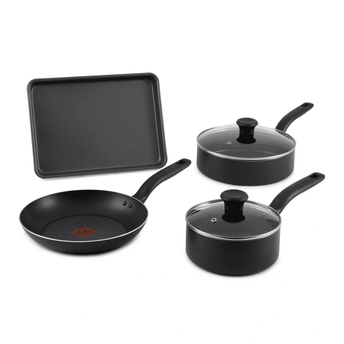 Includes:Cookie sheet, 10.5" Frying Pan, 2 qt. Saucepan With Lid, 3 qt. Saute Pan With Lid