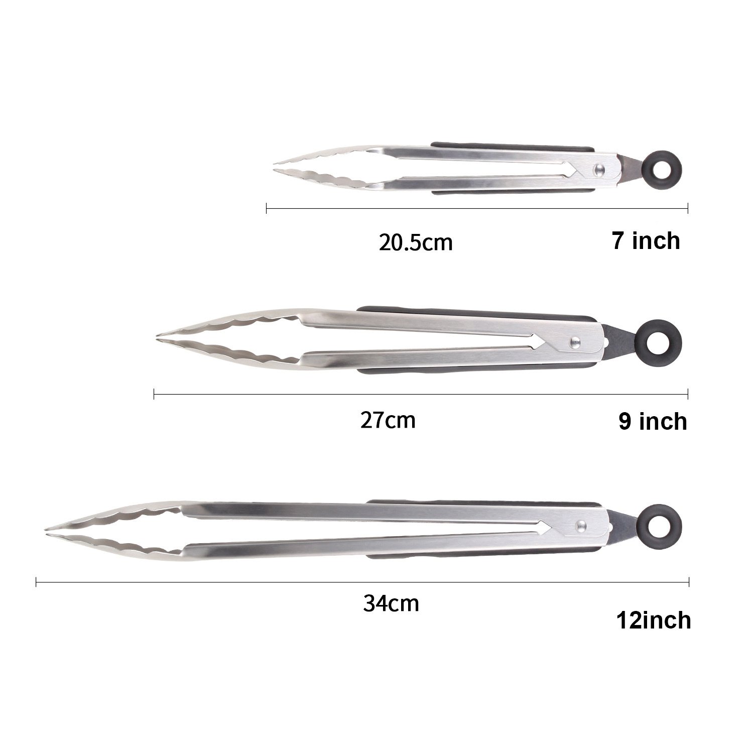 5.MULTIPLE APPLICATIONGS : The kitchen tongs set contains 3 sizes - Small 7", Medium 9", Large 12", making it perfect for basic kitchen tasks, be it used indoors or outdoors.
