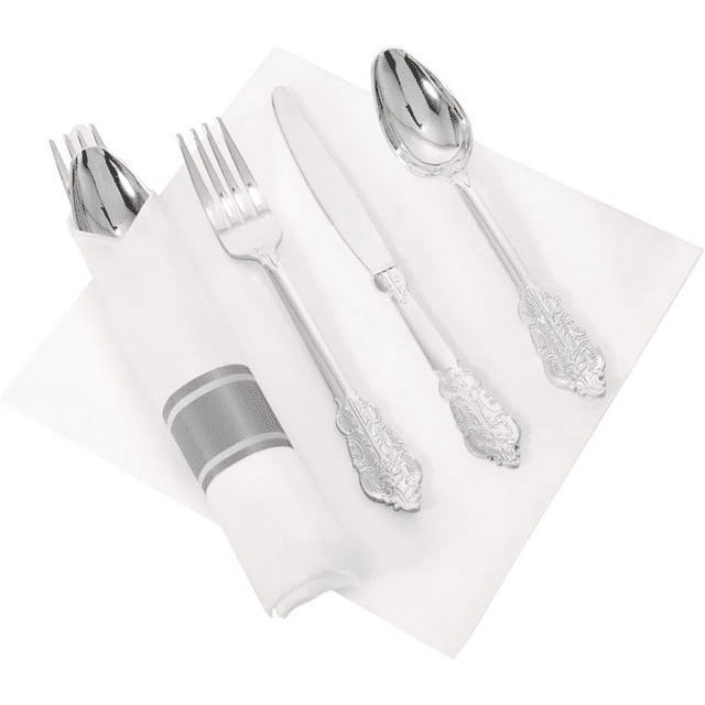 Great value 30 pack: while you purchase our silver plastic cutlery with pre rolled napkins.Nothing can add luster to your party more than these disposable silver plastic cutlery.
